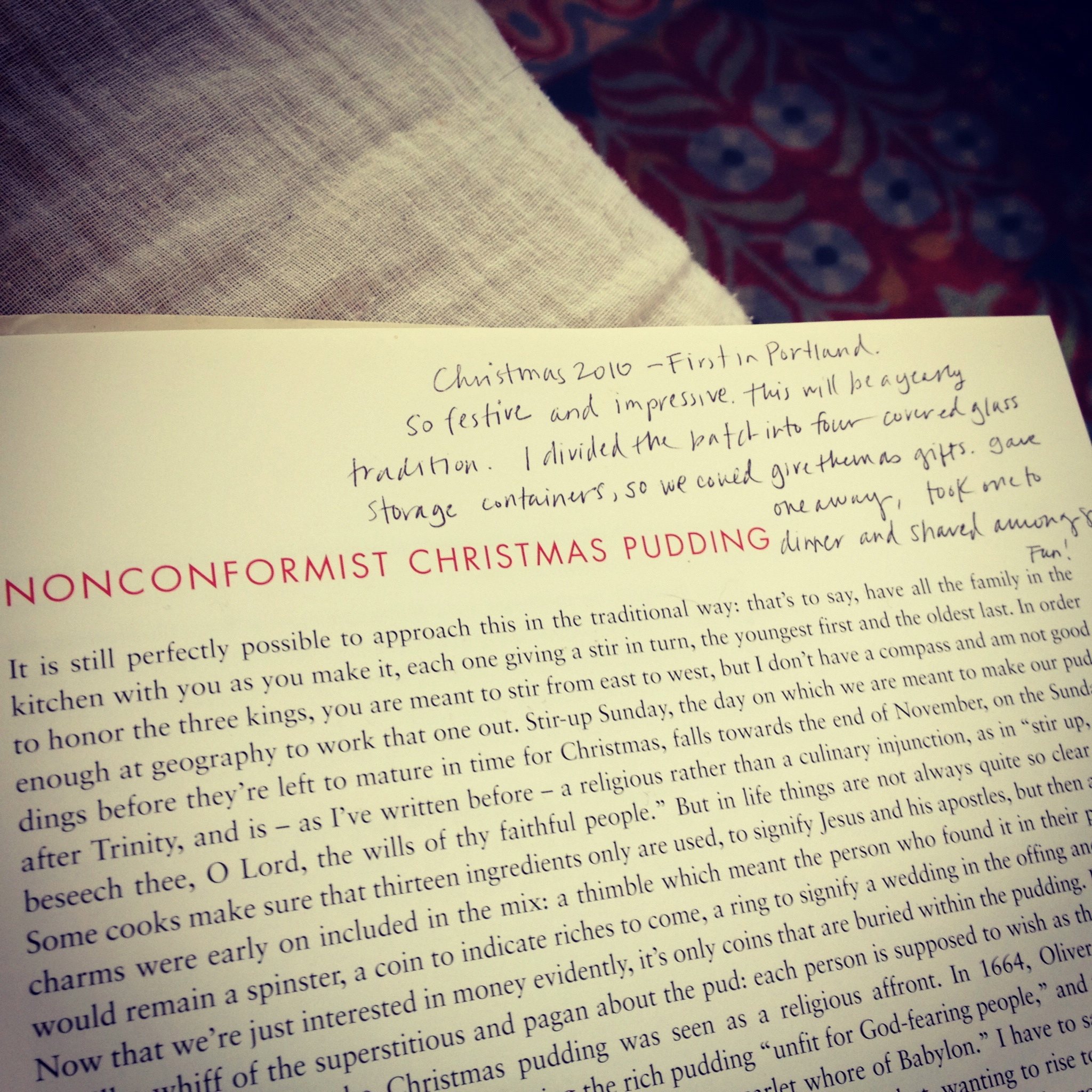 So the weekend after Thanksgiving, I make the puddings. I follow Nigella’s recipe faithfully, though it could be easily tinkered with. And because I don’t have a traditional pudding-steaming vessel I divide mine into four or five smaller glass containers with covers. The smaller portions make easy gifting and are easily stackable in the refrigerator. I skip the addition of the coins and tokens, which signify good luck, mostly because of laziness. Instead I send our good wishes along to everyone who enjoys the dish.