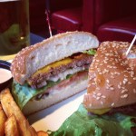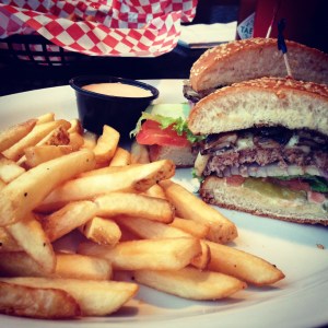 Now for the burgers. These are of the skinny-patty variety, and not a bad example at all. Despite being skinny patties, mine was medium rare — a pleasant surprise. The bun was a decent sesame seed kind. Good bun/patty ratio. Critical. The fixins were lettuce leaves (not shredded), dill pickles, sliced red onions, sliced tomatoes and mayo, resulting in a pleasant flavor combination. In our experience, the skinny-patty burger is as much about the accoutrements as the burger itself. Skyline Burger’s version had a good mix. French fries accompanied the burgers: lovely flavor, could be crisper. But what what’s this? Fry sauce? Why, Skyline, we didn’t expect to see this home-state (Utah) standard here. And is that a hint of horseradish? Well played. We ate. We sipped. We were pleased. And full.