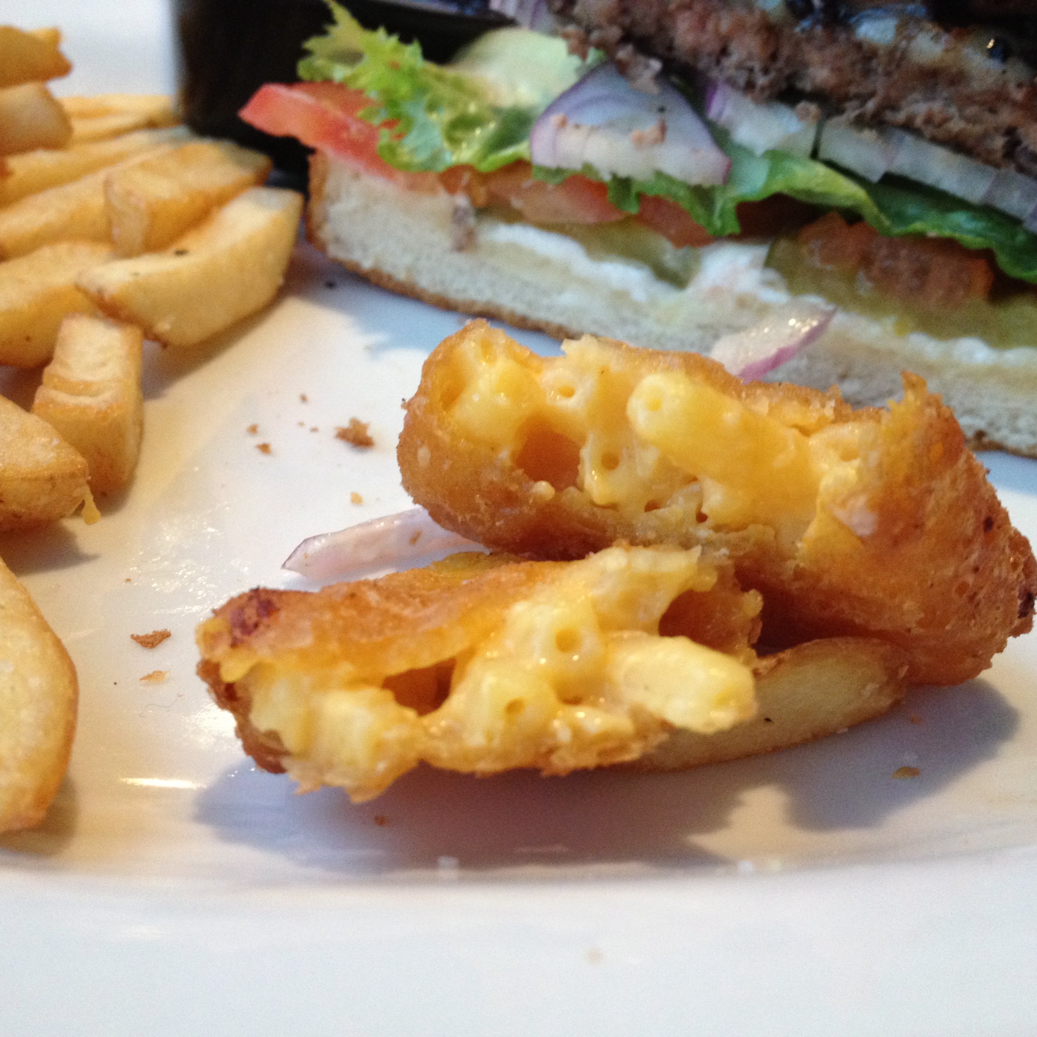 We sat down at one of the booths next to the front windows and ordered a couple of drinks — a full bar is always welcome during or after an epic walk. The meaty menu comprises apps, sandwiches, burgers, dogs, salads, soups, classic diner entrees and fountain drinks. We knew going in what we were going to order. If “burger” is in the name, that’s what we’re eating, by golly. For me, a mushroom Swiss burger. For J, a giant cheese burger with bacon. To start, mac-and-cheese wedges (can’t put something as wacky as that on a menu and not expect me to order it) and a cup of split pea soup.