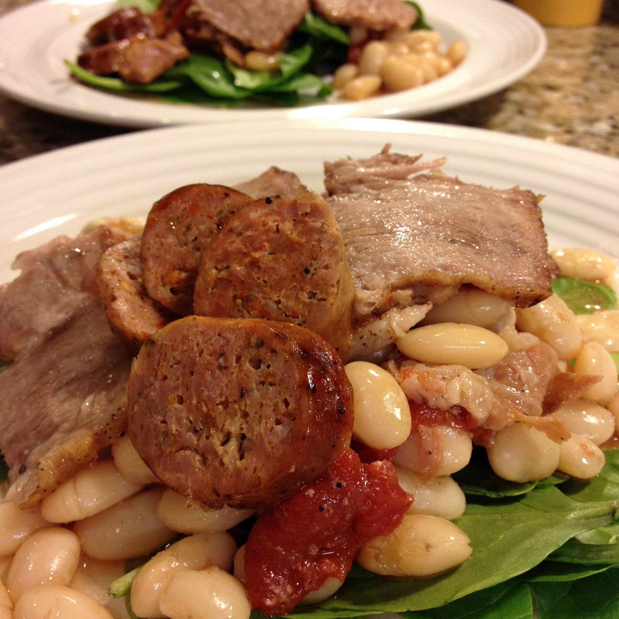 Cover and bake until the beans have absorbed all the liquid and are tender, about two hours. A meat thermometer placed in the center of the pork should register 160 degrees. Remove the pork shoulder and the sausages and cut into slices. Serve beans and pork in bowls or deep plates with perhaps a good crusty bread to sop up any juices.