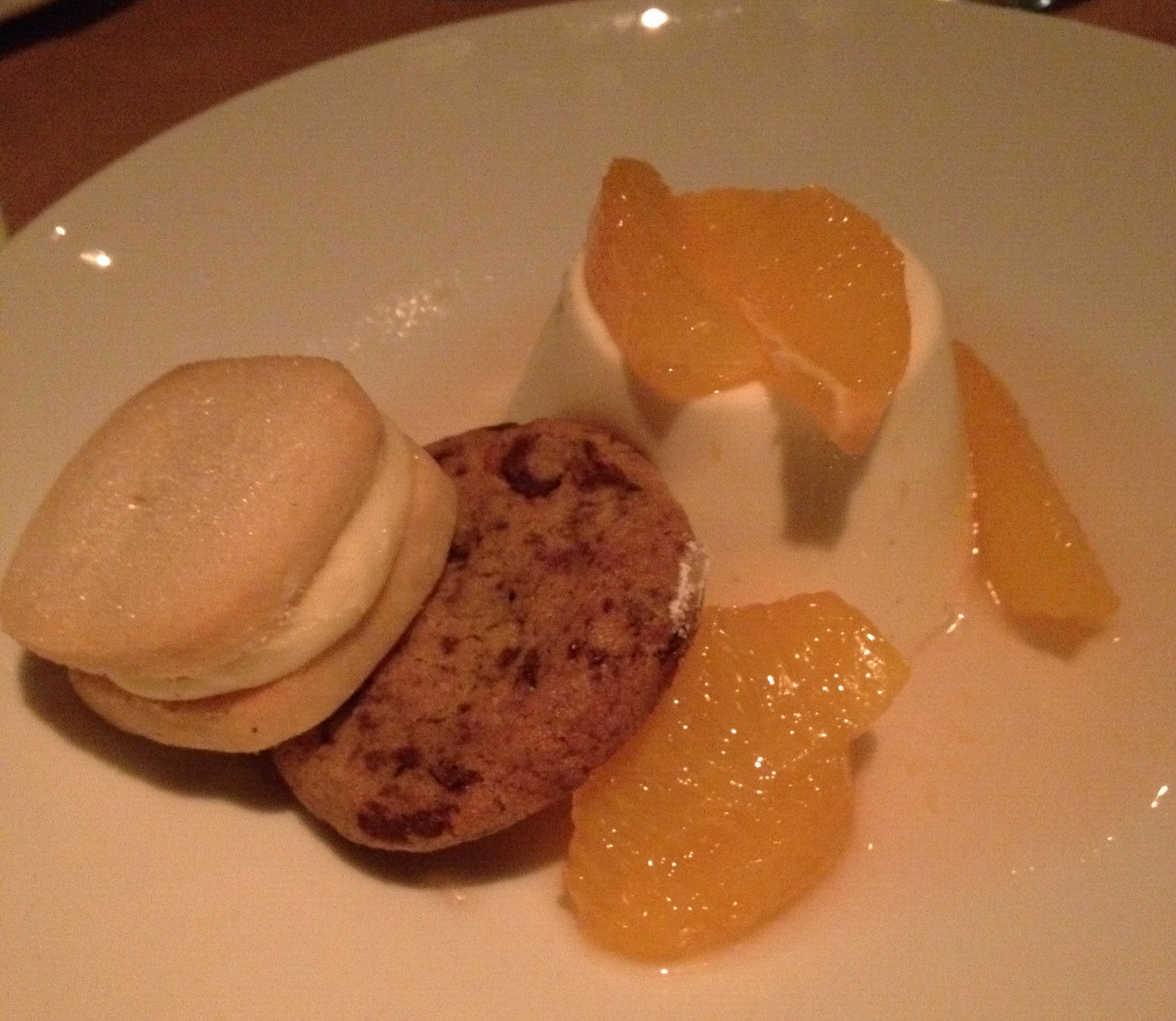 Desserts were chocolate profiteroles for J; bright citrus panna cotta for Zandra; and a cheese board for James and me.