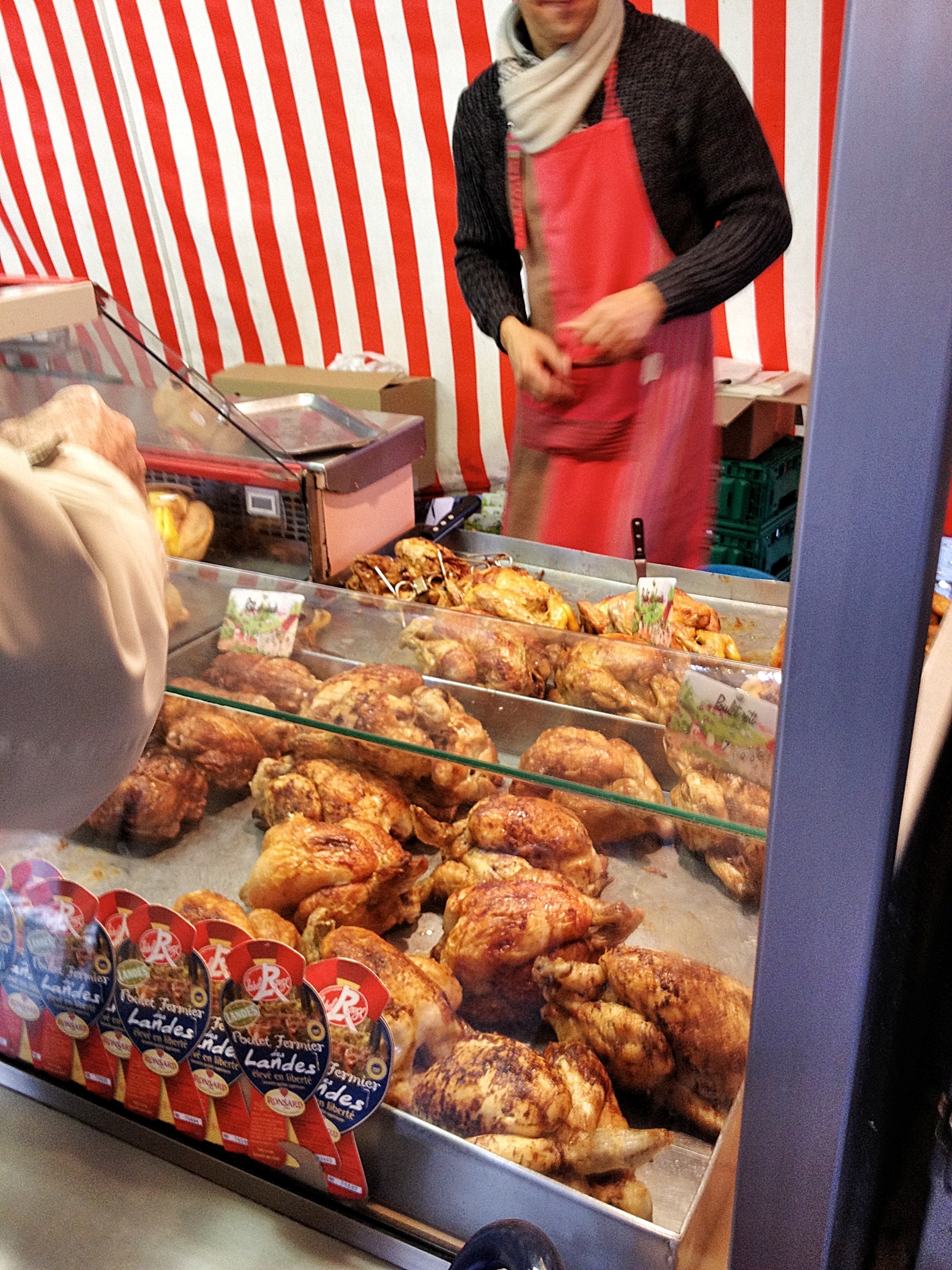 Bread stands smelled of warm yeast. There were nuts and fruit and pizza and smoked fish and a food cart selling egg rolls and noodles. Tall multi-rotisserie glass-cased ovens churned with succulent golden chickens, a dozen at a time, their drippings seasoning potatoes and tomatoes roasting below. The aroma was intoxicating. Would it be odd, I wondered, if I loitered here next to the poulet rôti for the next 30 minutes?