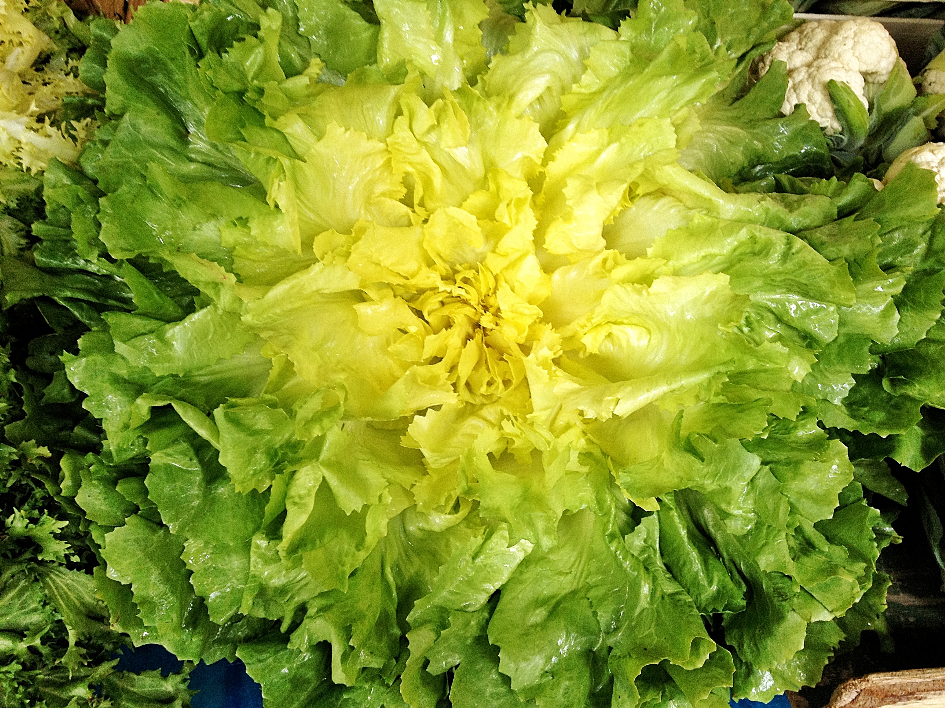 There were fat sausages, and salami with powdery rinds; head and haunch and every other cut of lamb and pork; skinned splayed rabbits; vats of olives, green and brown and black, displayed alongside tubs of cornichon and pickled garlic cloves; bushel baskets of beautiful lettuces, tomatoes, onions, fennel; knobby carrots with soil clinging to them.