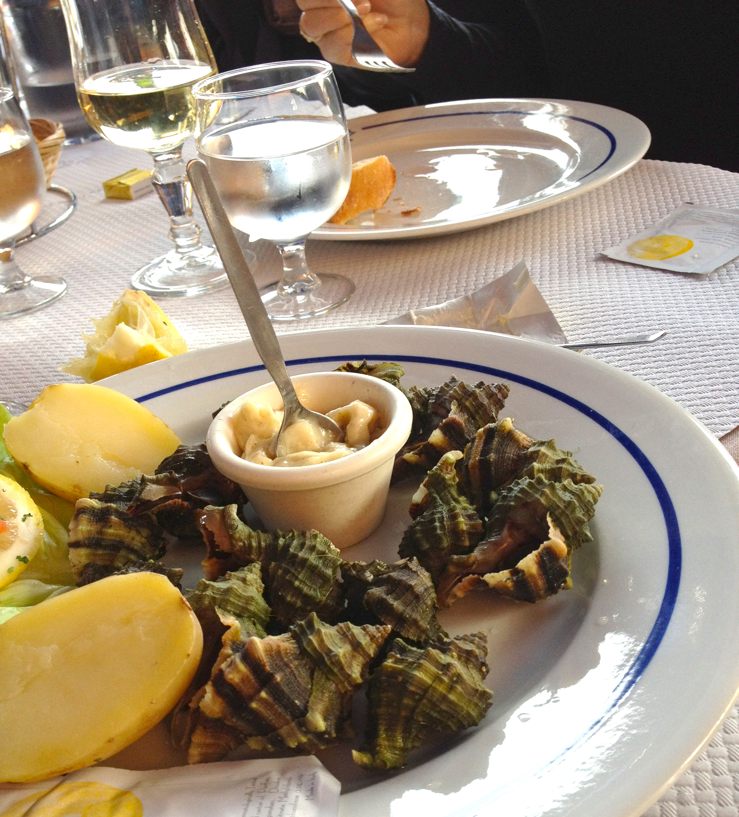 After wedging the Jumpy into a tight underground parking space we ascended into the misty seaside sunshine. At Chez François, we pulled a few tables together on the tented sidewalk, inhaled the sea air and looked over the brief, fish-focused menu.
