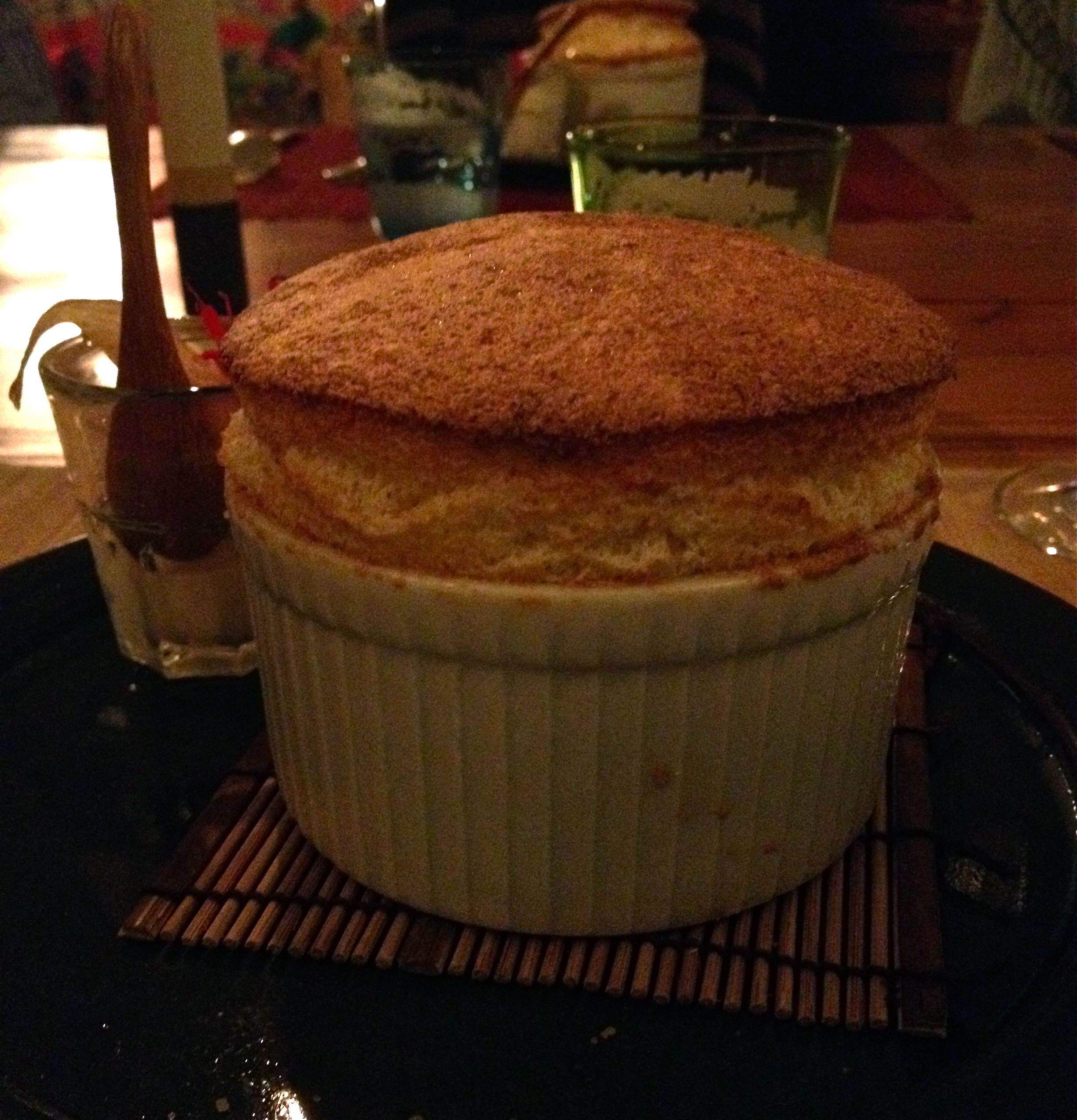 The Feast: Chef Armand Arnal welcomed us and explained the restaurant’s concept: everything local and seasonal, vegetables and herbs from the surrounding gardens, no butter or cream. Zandra and I exchanged a doubtful wink. No butter? Not possible. The vegetables we’d encountered on the trip had been slathered in it. But when the beautiful family-style dishes appeared, it was clear our skepticism was premature. This was fresh, clean food prepared simply so the flavors of the products shone. Among the first courses, bright herbal soup that was the very definition of green both in color and flavor; a frisee salad with crispy fried pumpkin seeds; beet and eel salad with wilted greens. For the main courses, a few at the table had lamb while the majority ordered sea bass baked in a salt crust, uncaked and served tableside. For dessert: airy souffle with passionfruit ice cream.