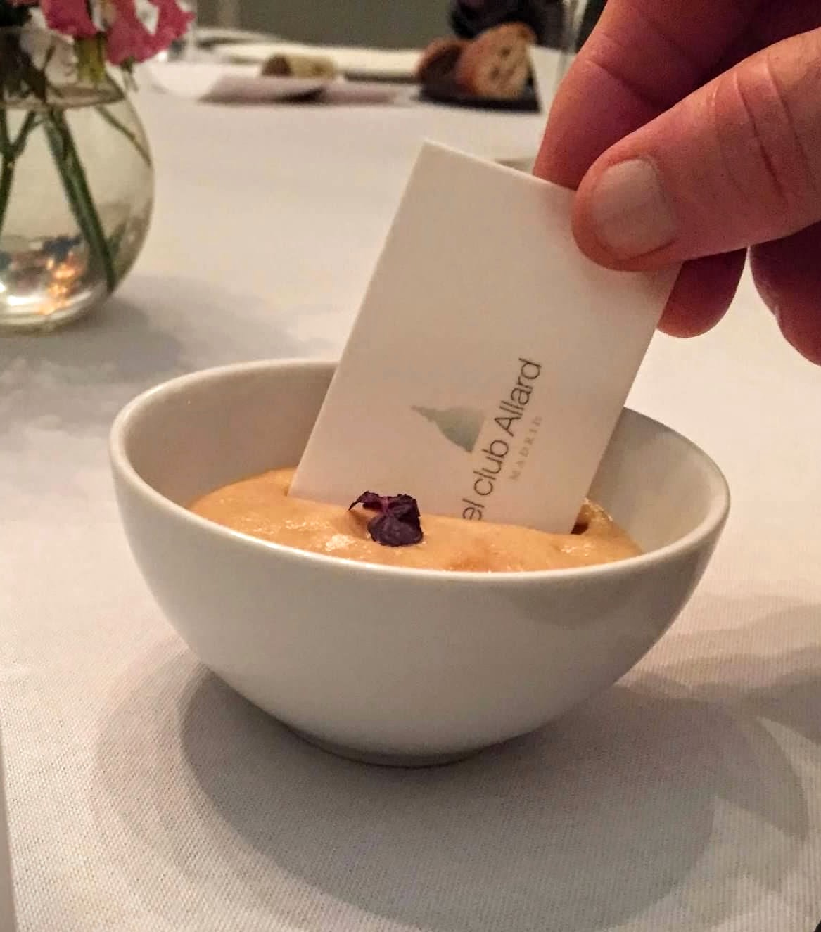 Amuse-bouche at El Club Allard: an edible card with flavorful aioli