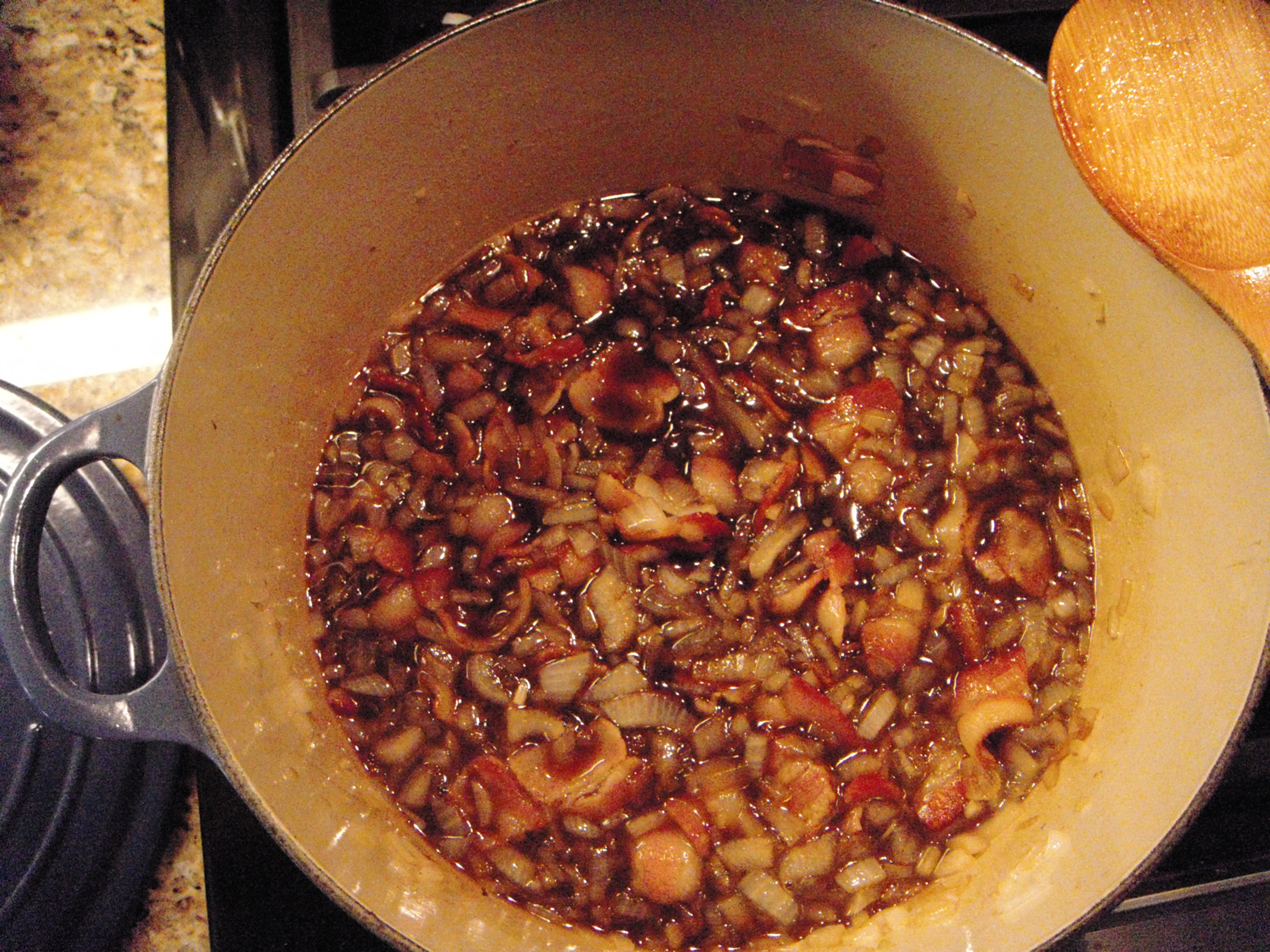 Preheat oven to 350. Sautee the bacon in a Dutch oven or deep oven-proof skillet until soft, but not crisp. Add the diced onions and cook until translucent. Add the sugar, molasses, bourbon, barbecue sauce, stock, tomatoes, clove, mustard, salt and stir until mixed. Bring the mixture to a boil to thicken slightly. Add the beans and bring to a simmer.