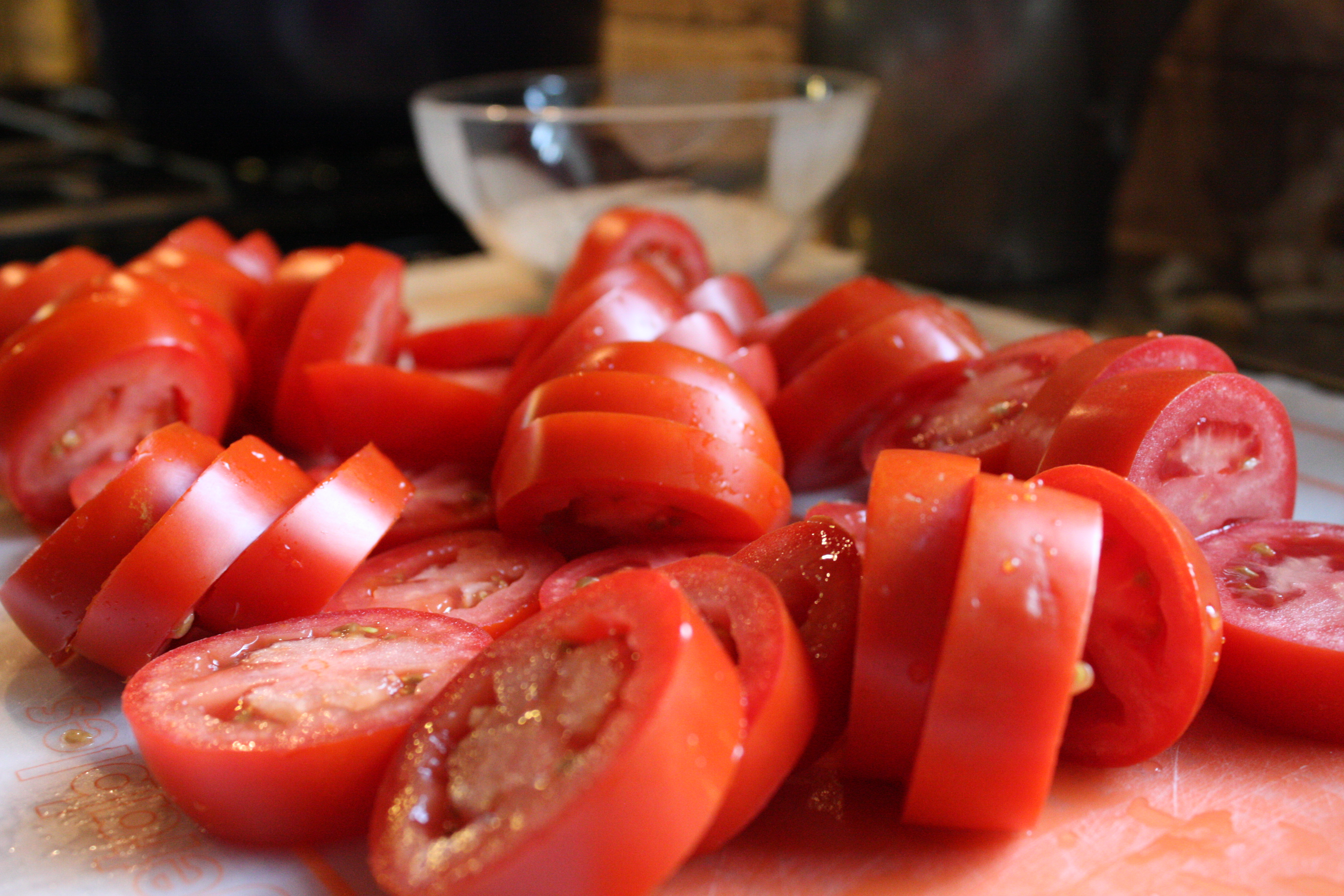 - Thick-sliced Roma tomatoes, ready for roasting.
