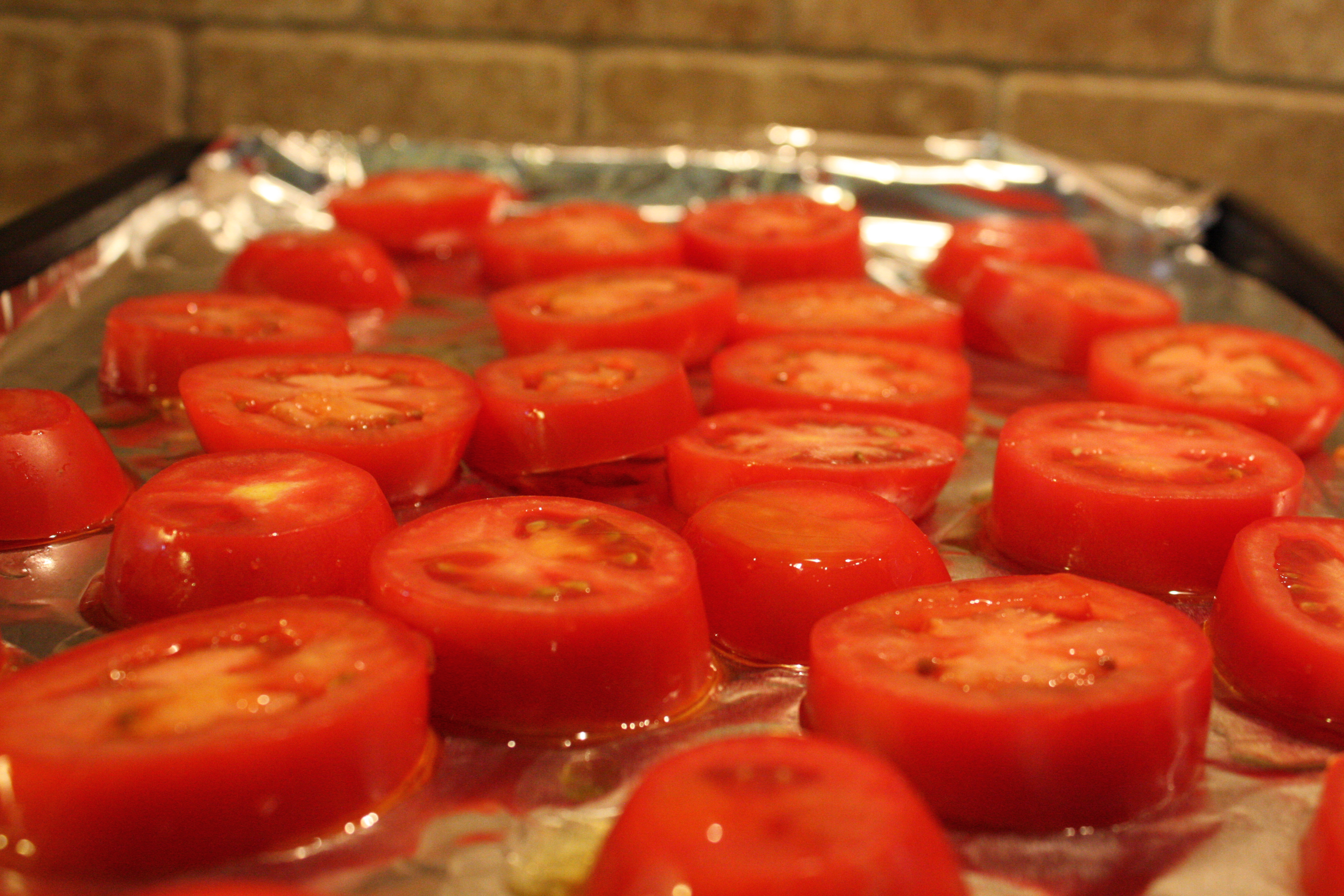 Pre-heat the oven to 250 degrees F. Line two cookie sheets with aluminum foil or a Silpat liner. Cut the ends off the washed tomatoes; cut into thick crosswise slices. 1/4 to 1/2 inch wide. (The thinner the slice, the more the tomatoes shrivel. I prefer thinner slices.) Arrange the tomatoes on the cookie sheets, and drizzle each slice with a bit of olive oil. Turn the slices over, and repeat on the other side.