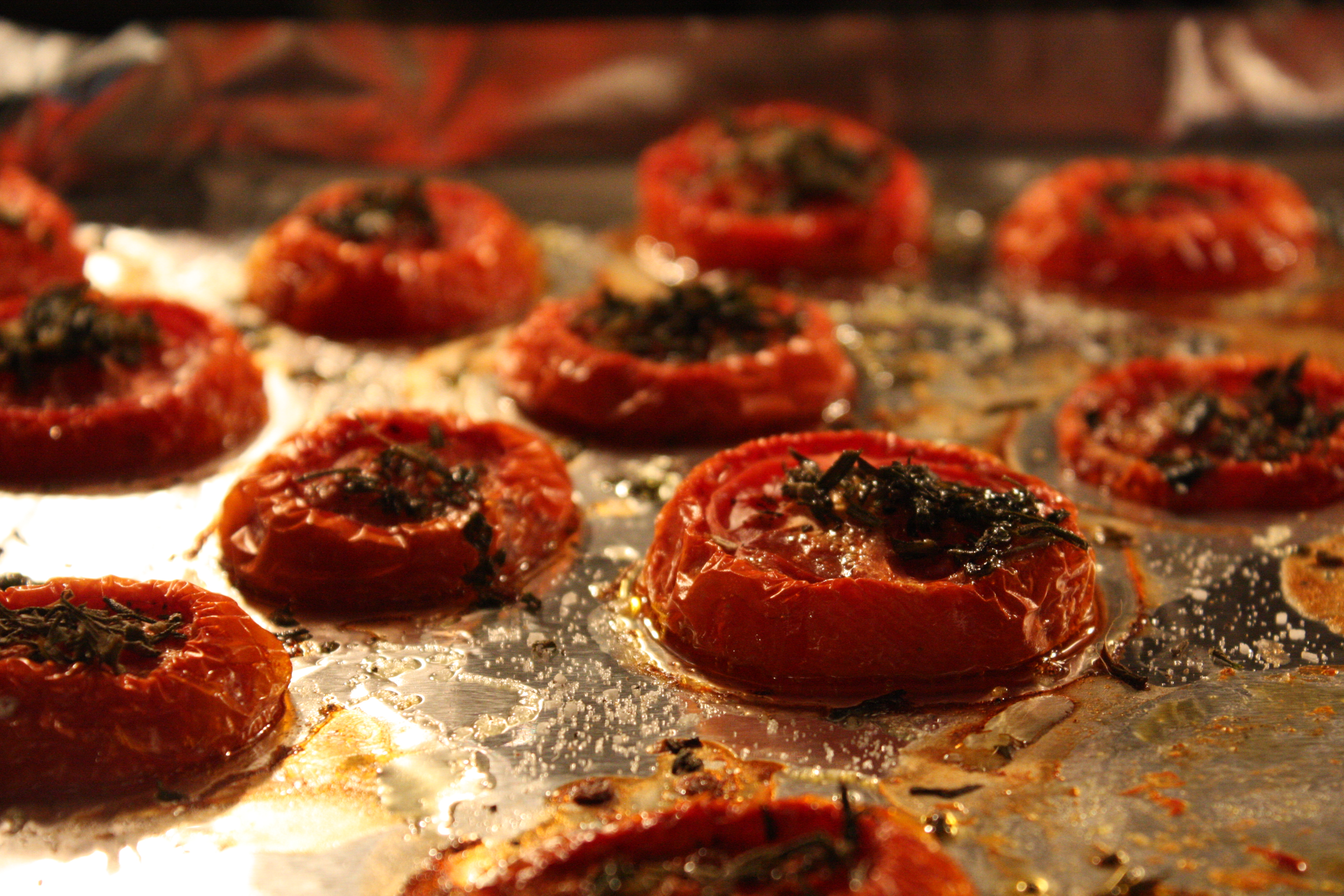 - Caramelized, roasted tomatoes topped with fresh rosemary and thyme.