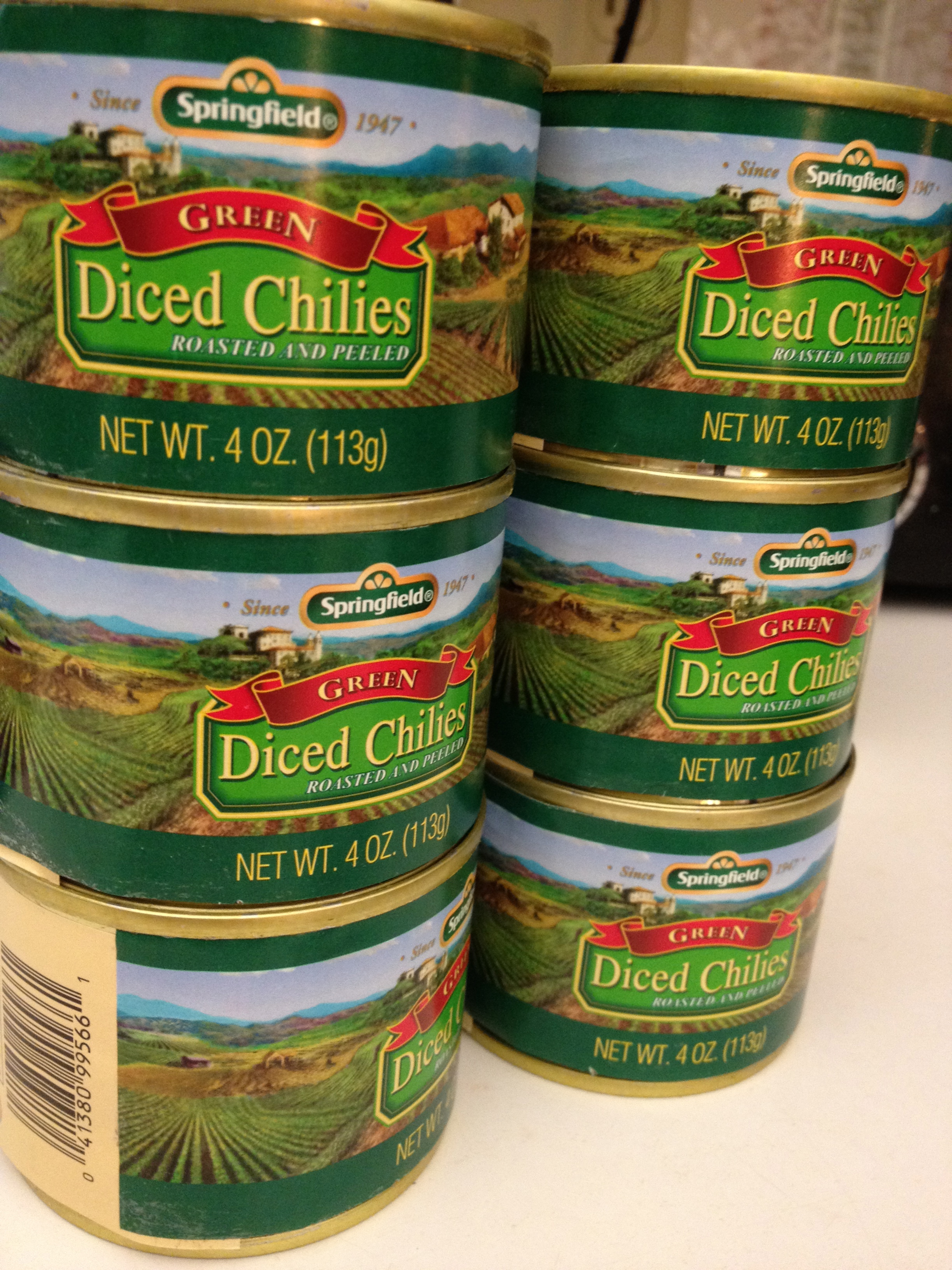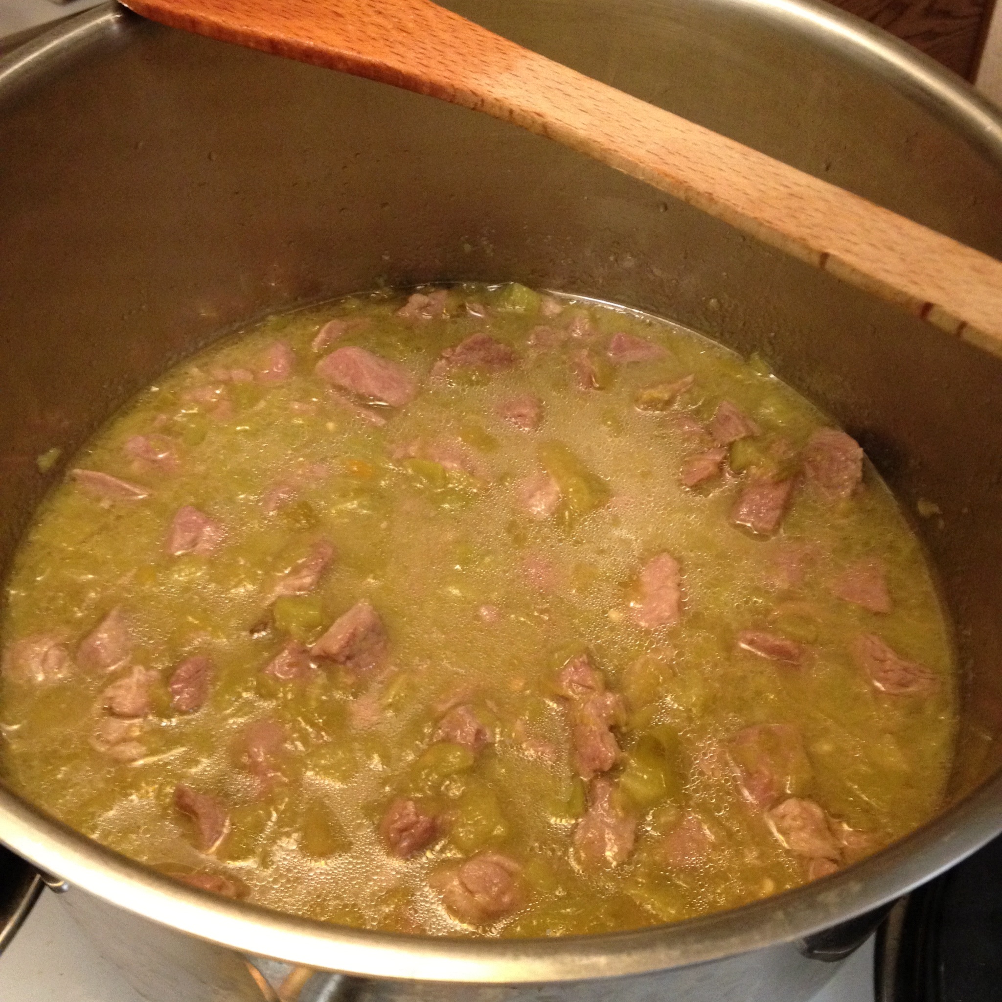 Pour a couple tablespoons of cooking oil into a Dutch oven or braising pan, add the pork pieces and season with salt. Place the pot over a medium flame and lightly brown the pork. (Don’t go overboard with the browning. Dad says it should remain “slightly rubbery looking.” Code for not-too-well browned.) Add the water, the canned chiles and the granulated garlic. Stir to mix and cover. Let simmer for about an hour.