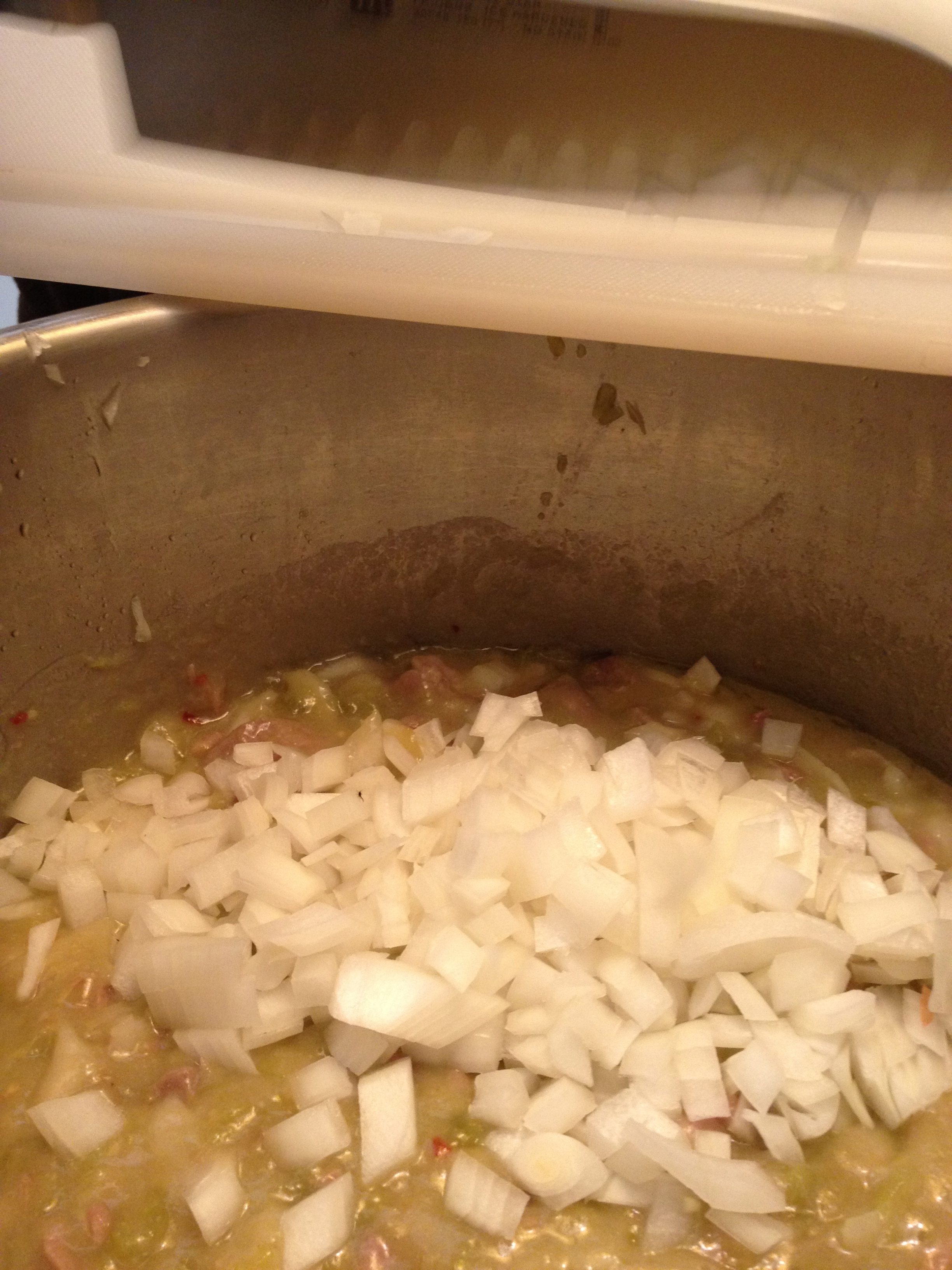 Put about 4 tablespoons of cooking oil, lard or butter into a heavy-bottomed skillet and heat over medium-high heat. Add the flour to the pan all at once and stir until it’s well mixed. Continue to cook over medium-high heat until the roux becomes a rich golden brown, maybe 7 minutes or so. Stir the the roux into the simmering chile verde and let it all melt together. Simmer for another 15 minutes. Add the chile flakes and the diced onion. Cook only for another 5 minutes or so. Remove from heat and serve over burritos or in a bowl with flour tortillas. (Preferably homemade.)