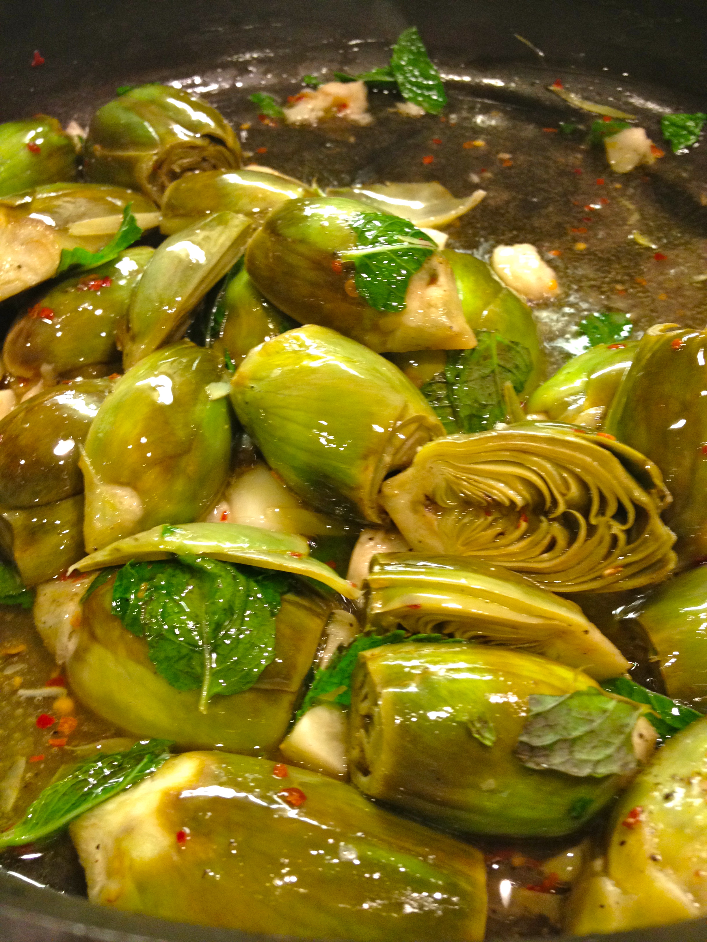 In a large skillet, heat the olive oil and the garlic until it is just golden. Drain the artichokes and place them in the pan stirring to coat with oil and garlic. Add the red chile flakes and a splash of wine and cook for 10 to 12 minutes, adding a little more wine along the way to braise the artichokes and keep the garlic from getting too brown. Season with salt and pepper, and about halfway through, add the torn mint leaves. Serve warm as a side dish, or as we did, as a first course. This would also be delicious tossed with fresh pasta.