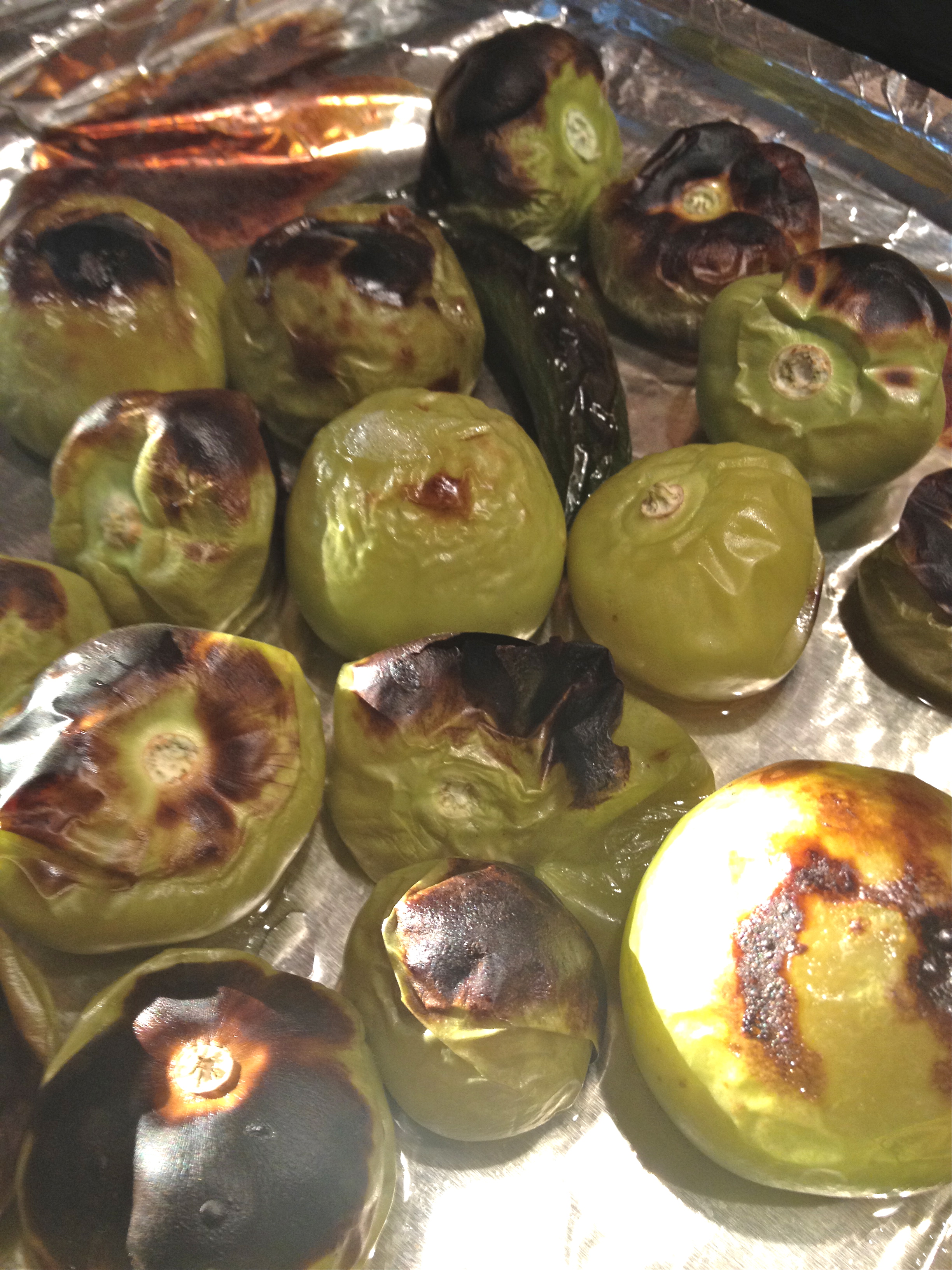 Last Sunday, tempted again by Mexico and by the fact that it’s tomatillo season, we launched into enchiladas Suizas. This too is a simple recipe once you get past the basic prep. The ingredients list calls for three cups of shredded chicken, expedited by the availability of grocery store rotisserie birds. Somewhat labor-intensive is the charring of the tomatillos (husks removed) under the broiler and then, without losing any juices, removing the thin skin to reveal the gelatinous membranes within. (Hint, do this part over the blender, ’cause that’s where they’re going.) There they are joined by two poblano and two serrano peppers (also blackened and peeled), 3/4 cup of sour cream, a cup of boiling water, garlic, cumin and cilantro, then blended until smooth. Mix a cup of the enchilada sauce with the shredded chicken and you’re ready to assemble.