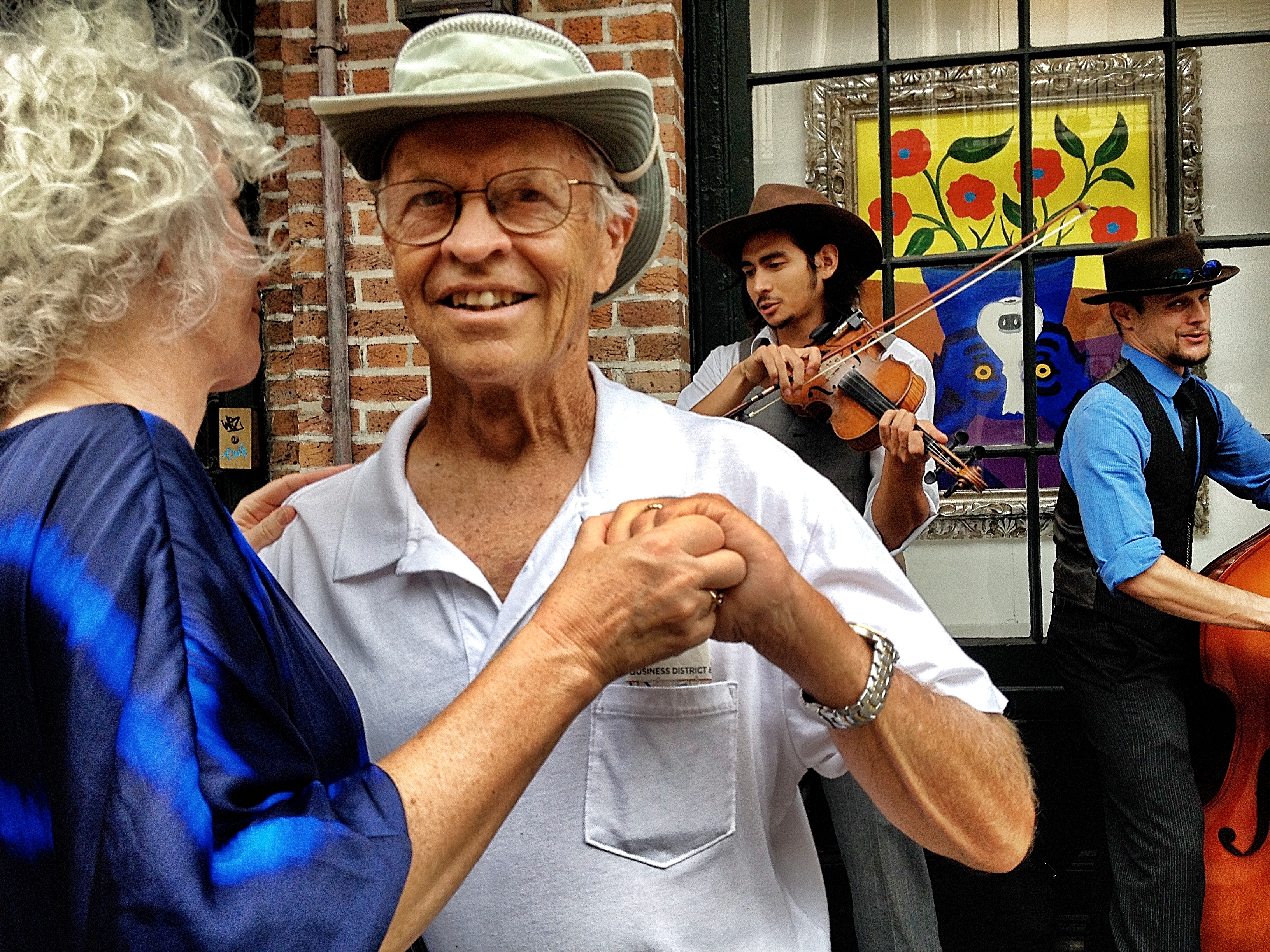 Sated (stuffed, really), we started our tour of the Garden District, beginning in Lafayette Cemetery, with its crumbling, time-stained vaults and distinct air of the supernatural. Our guide proved to be a font of information about the city, seasoning his stories with references to long-dead Confederate officers, Louis Armstrong, Katrina, Anne Rice, Nicolas Cage, Sandra Bullock, John Goodman, Mr. and Mrs. Angelina Jolie, the Manning boys, and on and on. Out into the neighborhood we wended amid the twisting, towering live oaks and the enormous wrought-iron-frilled mansions. Once again, we were the beneficiaries of Dorothy’s knack for finding interesting people, places and things to do.
