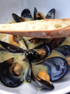 The line between hors d’oeuvres and plats principaux was blurred with the arrival of gratin d’escargots, a decadent melted melange of Gruyere, ham, snails, mushrooms and herbs over crouton. By this time we could have been done and happily so, but two empty bowls foretold the coming of shellfish. And, lo, two servings of plump mussels landed in front of us, swimming in a soppable soup flavored with garlic, fennel and vermouth.