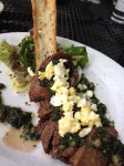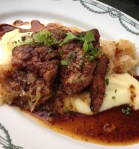 Plated on mismatched grandma’s china, the mousse and the tripe were beautiful to look at, beautiful to taste. Silky, creamy mousse spread on slices of baguette was earthy and gratifying, but the tripe … oh my. A far cry from the gamey, rubbery tripe I’m familiar with, this had to have been soaked in milk for hours. Mildly flavored with a soft, melting texture under the crisp golden batter, and served with capers and red onion mayonnaise, it was simply delicious.
